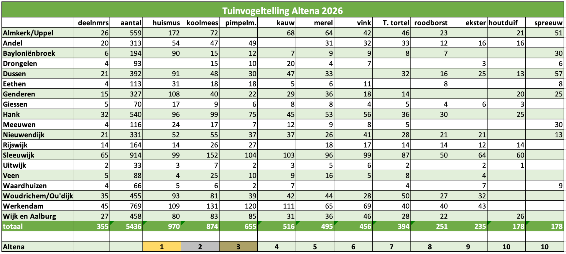 Jaarlijks is er in Nederland de Nationale Tuinvogeltelling in het laatste weekend van januari. Dit jaar telden bijna 140.000 tellers een kleine 2 miljoen vogels! Ook in Altena werd er fanatiek geteld. 355 deelnemers telden 5436 vogels. De top 3 is in Altena hetzelfde gebleven als vorig jaar. Vogelbescherming Nederland en Sovon organiseren en verzamelen elk jaar de gegevens en wij hebben ze van Altena in een tabel samengevat.