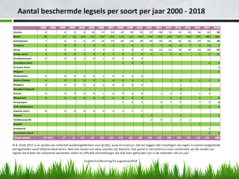 Het aantal vrijwilligers daarentegen neemt gestaag toe. Dit jaar waren het 85 enthousiaste vrijwilligers, die zich actief ingezet hebben voor weidevogelbescherming op de percelen van 146 bedrijven. Er zijn er echter ook die zich na al die jaren terugtrekken, daarom zijn nieuwe vrijwilligers van harte welkom om hun schouders onder dit belangrijke werk te zetten.